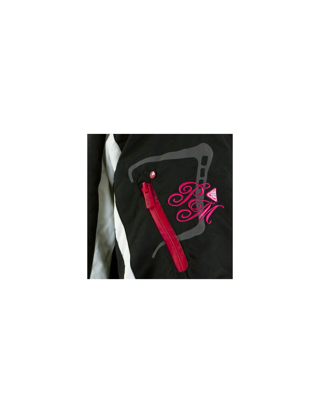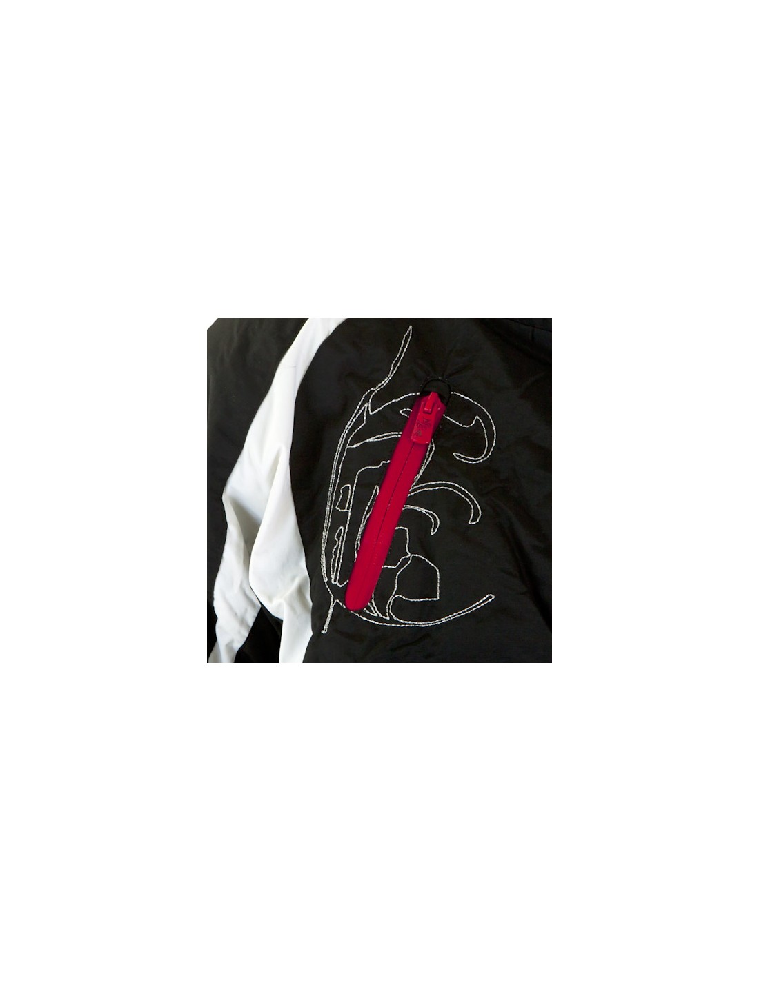 Broderie et poche zip retournée sur la manche gauche